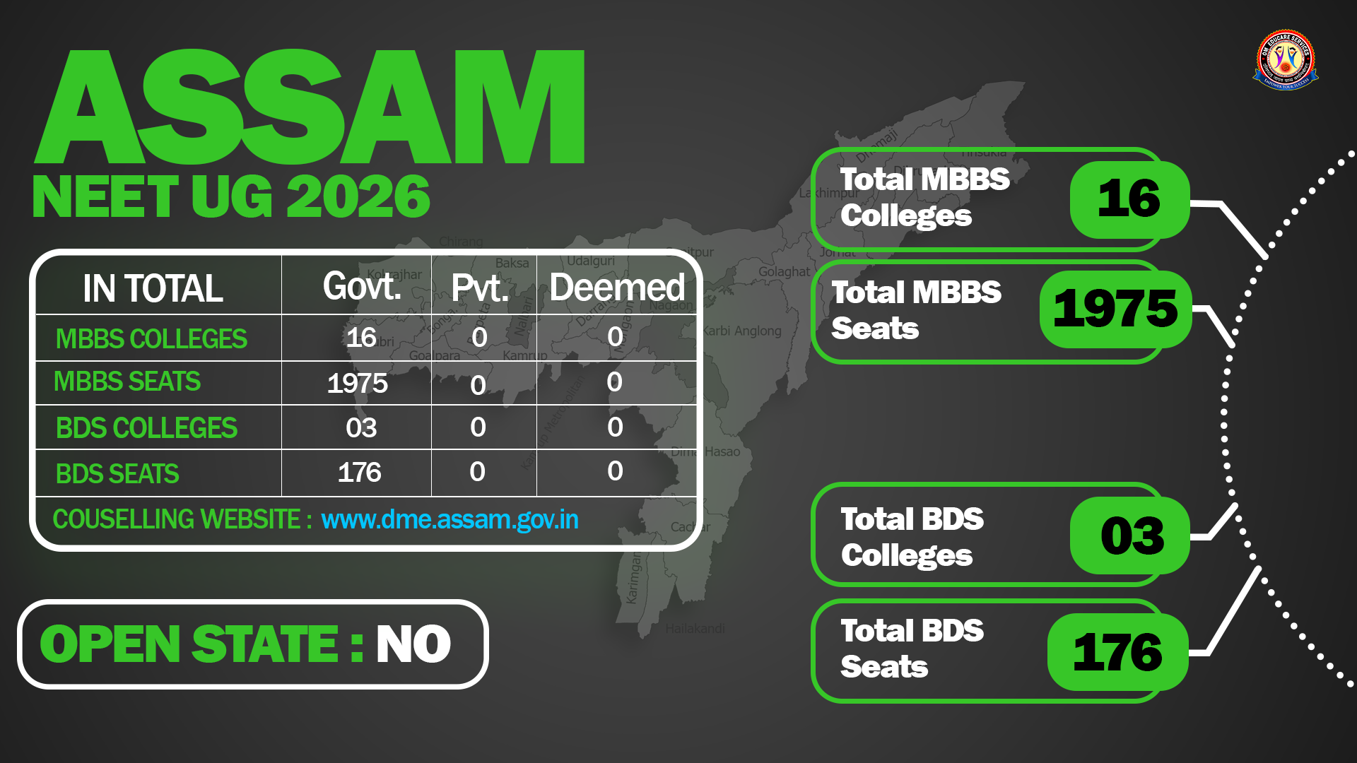 The admission process for the 1st year MBBS and BDS courses in the government colleges of Assam is regulated by the Directorate of Medical Education (DME), Assam. Selection is based on the merit of the National Eligibility cum Entrance Test (NEET). A Selection Board, chaired by the DME, is responsible for the physical counselling and seat allotment process.